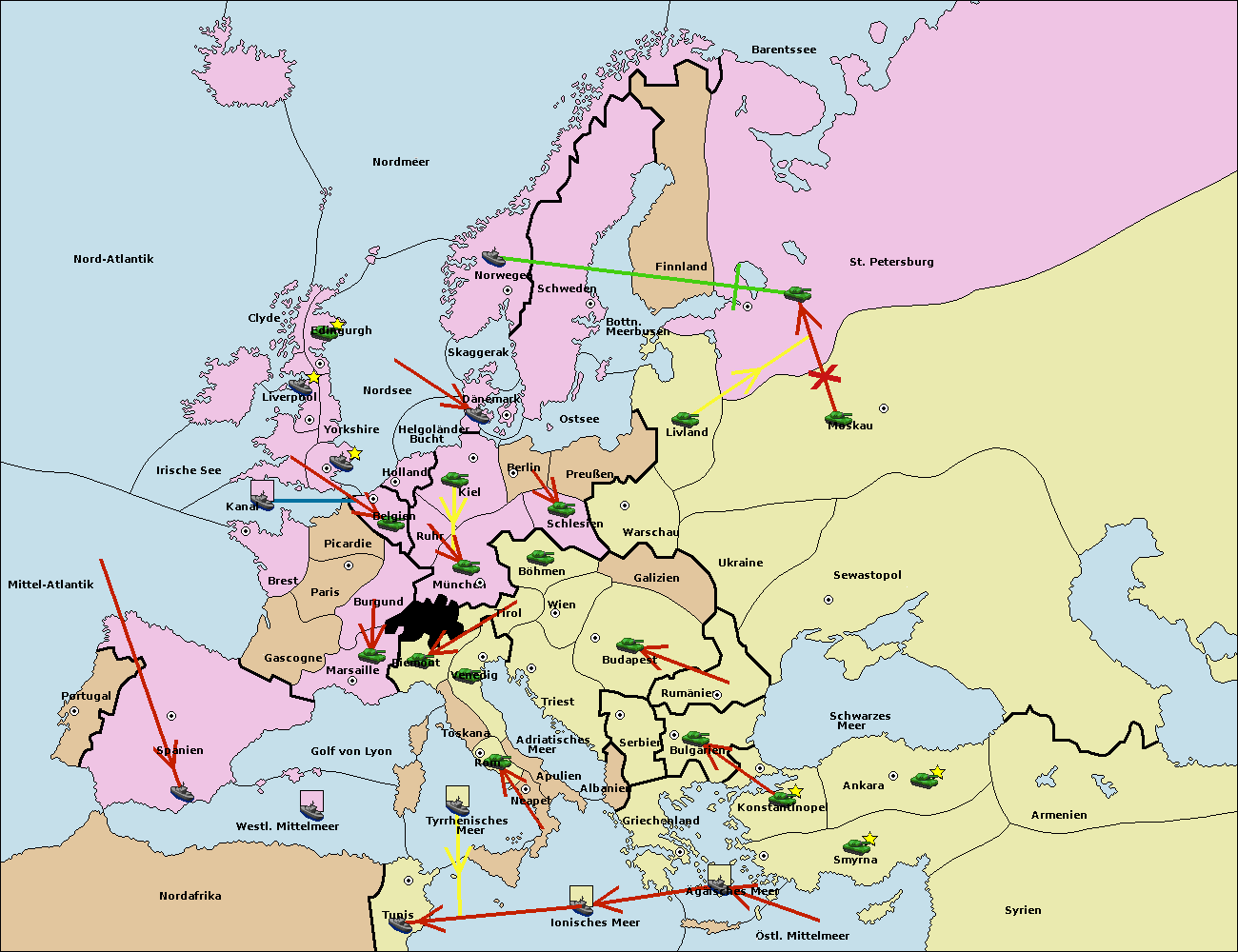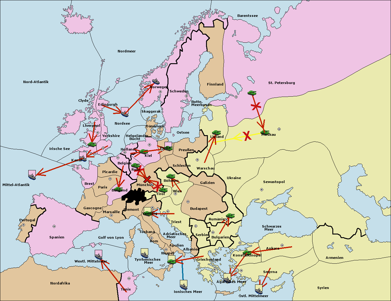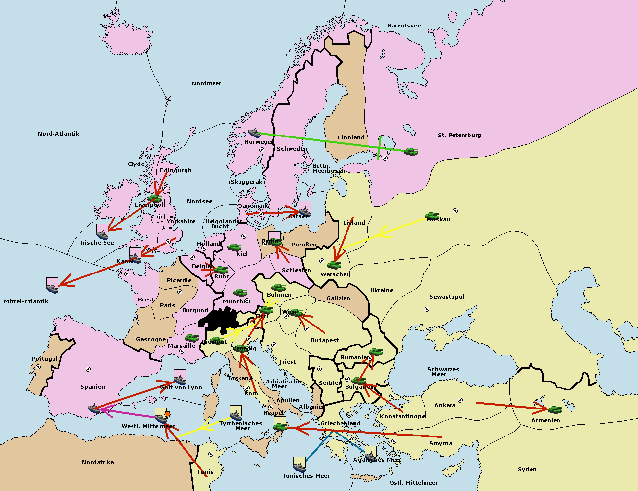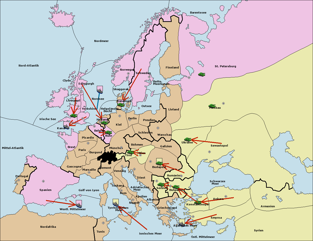 • Die Flotte in Bulgarien (Südküste) move nach Griechenland.