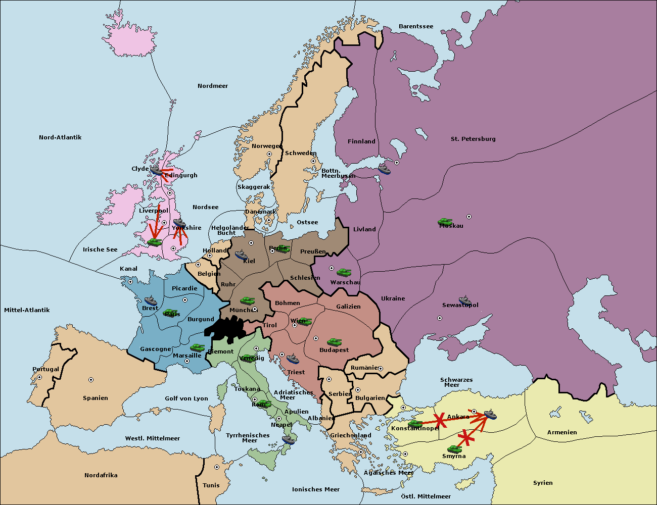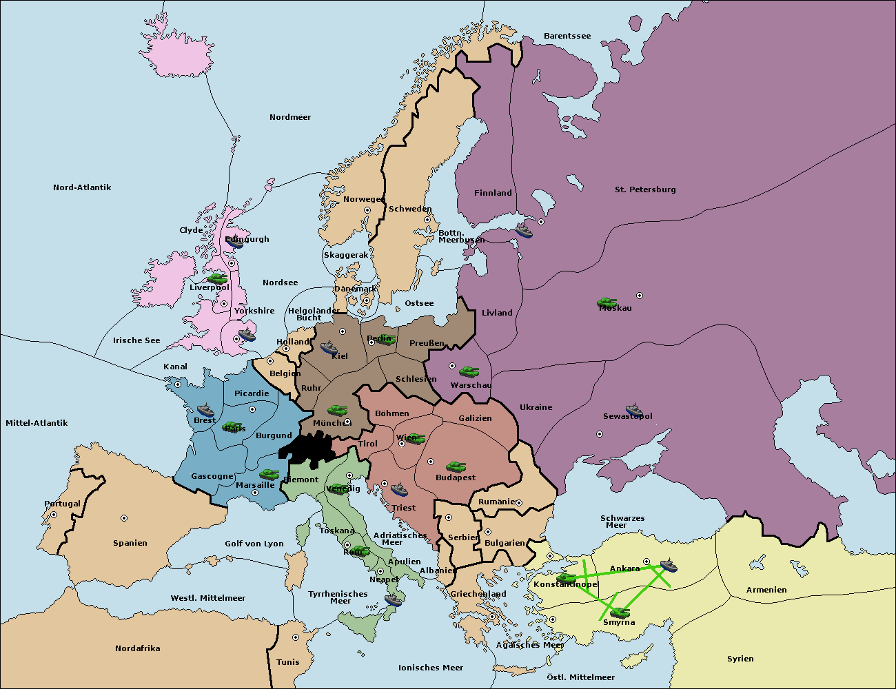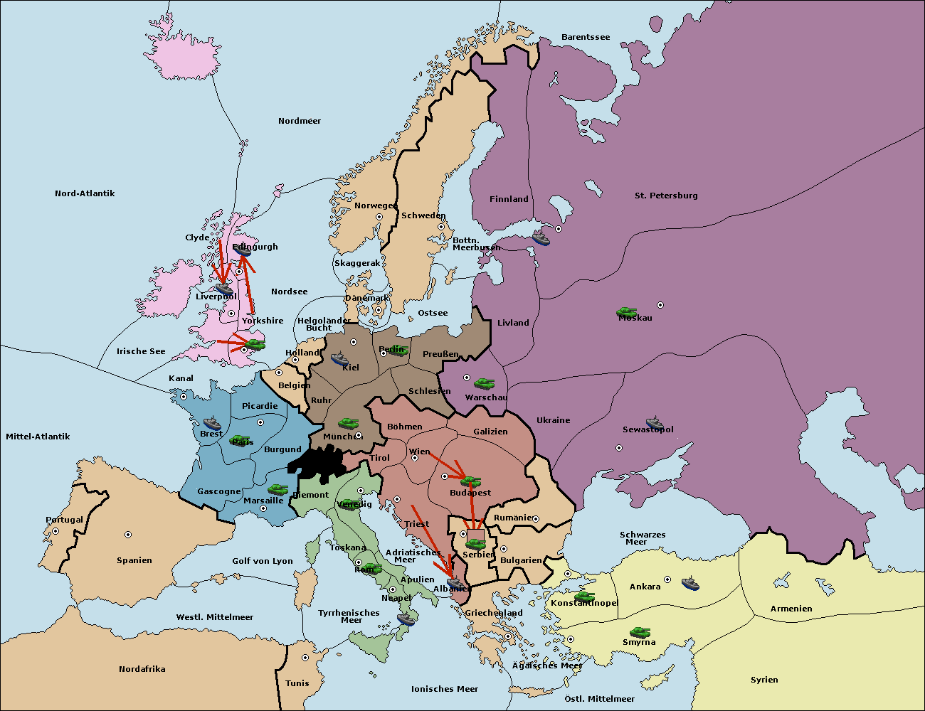 This is a moderated game. Gamedirector: Racolm (1321 ).Willkommen zum PLACK-Alphatest. Diese Partie dient lediglich der Diplomatie. Es werden unten ausschließlich Haltebefehle abgegeben und schlussendlich wird es nicht gewertet. Das eigentliche Spiel findet im Forum statt. Eure Züge müsst ihr mir per Privatnachricht zukommen lassen (Mein Profil ist oben verlinkt). Grundsätzlich gelten die so abgegebenen Züge als final, damit ich die Übersicht wahren kann. Im Zweifel kann man aber immer Ausnahmen machen, die dann aber von euch gekennzeichnet werden sollten, damit ich erkennen kann, was ihr zuletzt ziehen wollt. Setzt eurer Befehlsabgabe bitte den jeweiligen Zug und eure Nation voraus [Bsp. Frankreich- Frühjahr 1902 (Rückzüge)]. Wie eure Befehle aussehen könnten, ist hier einmal veranschaulicht: