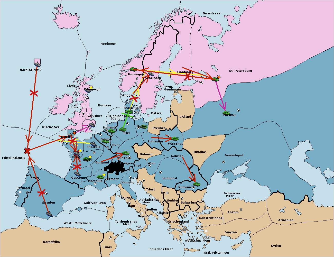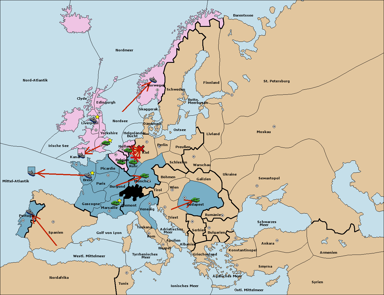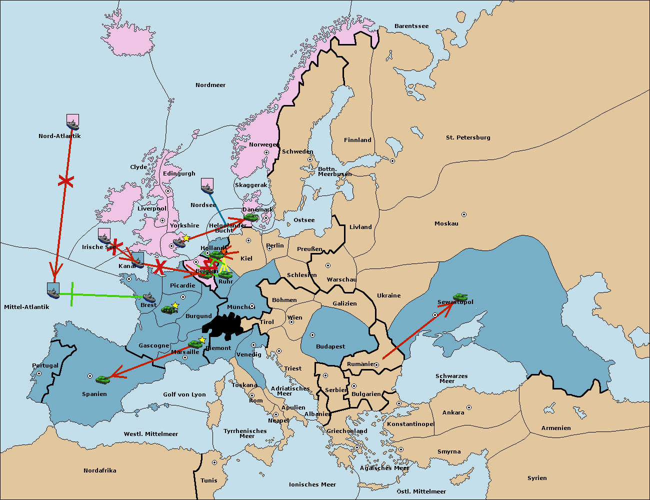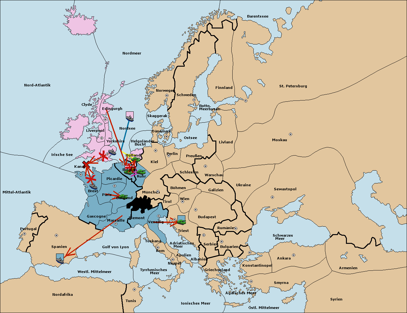 • Die Flotte in Spanien (Südküste) move nach Portugal.
