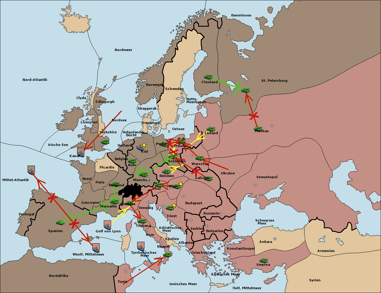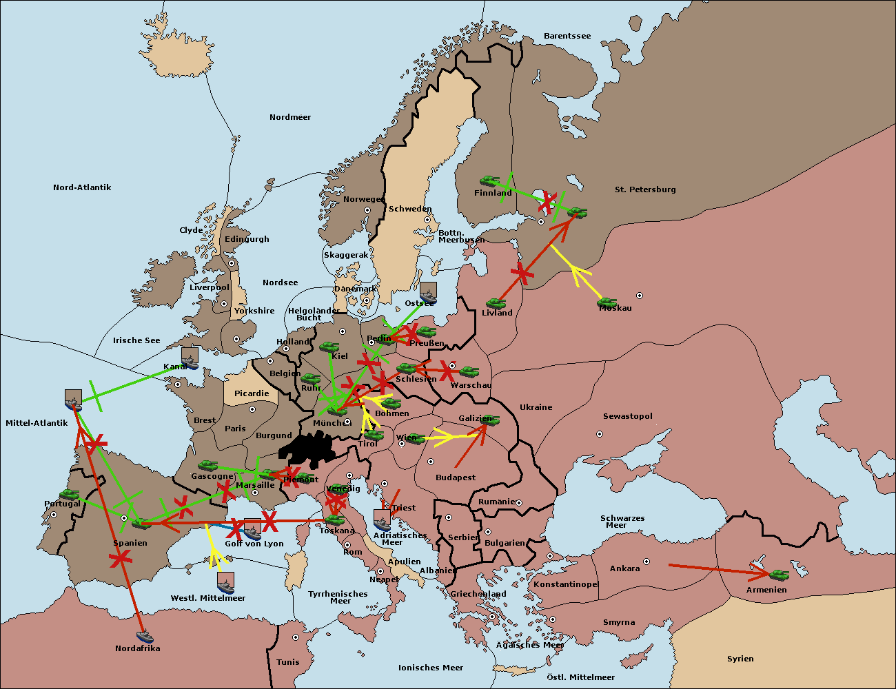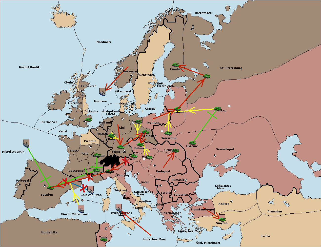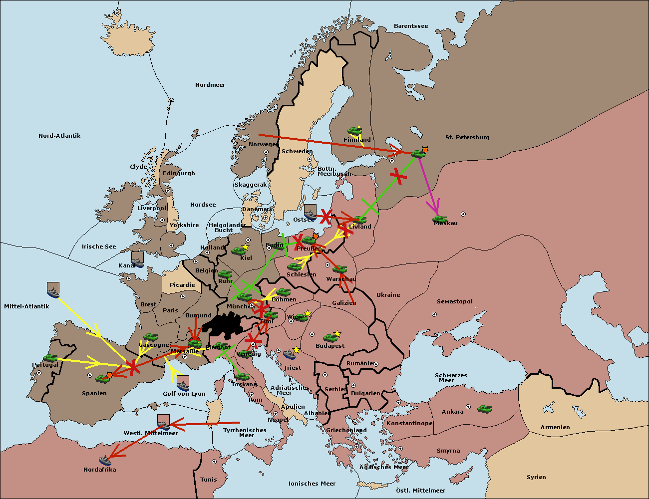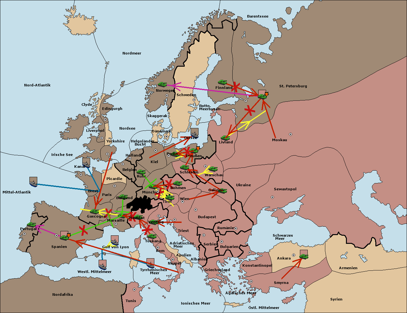 • Die Armee in Marseille support move nach Spanien von London. (gescheitert)