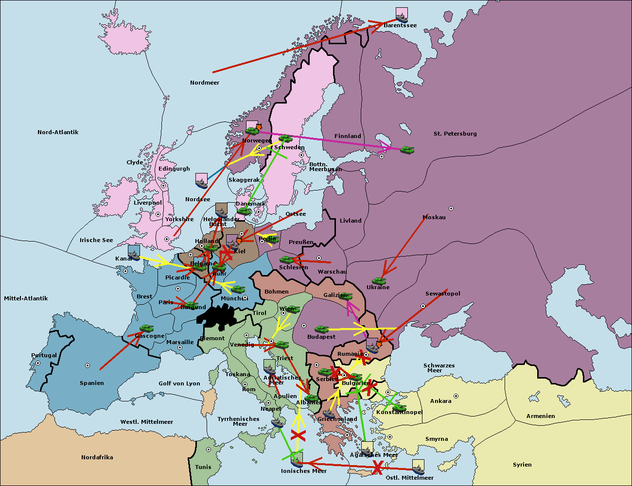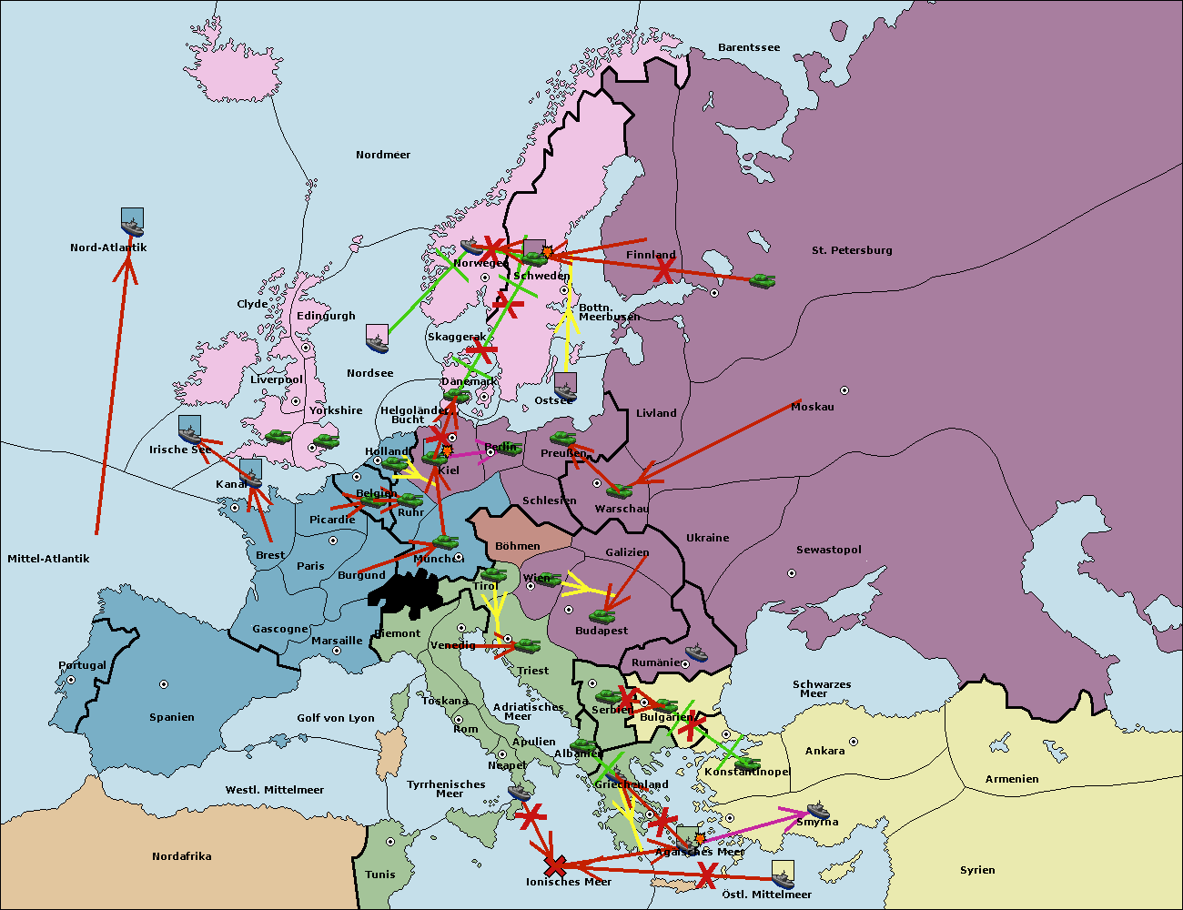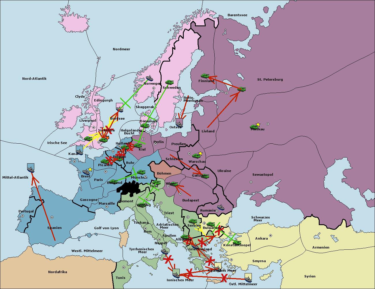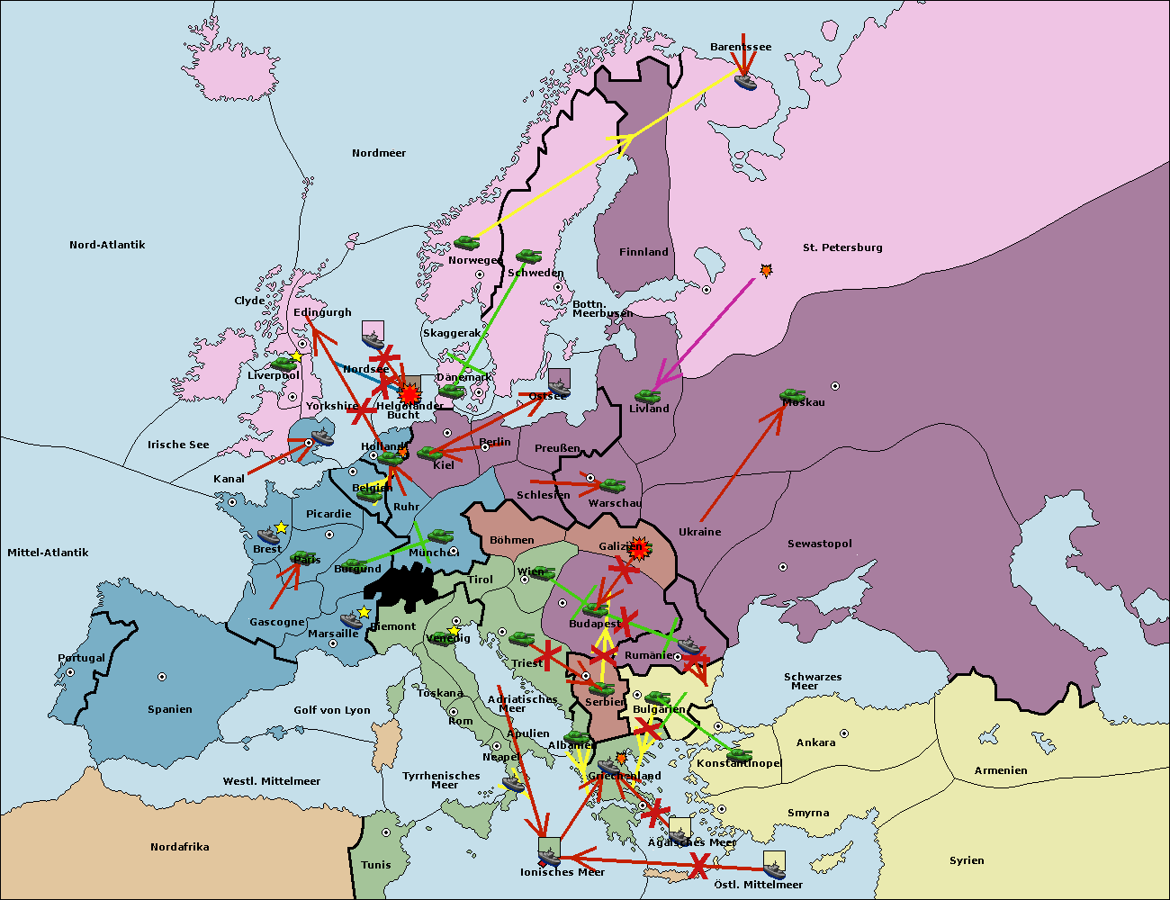 • Die Armee in Kiel wird zerstörtFlotte in Kiel gebaut.
