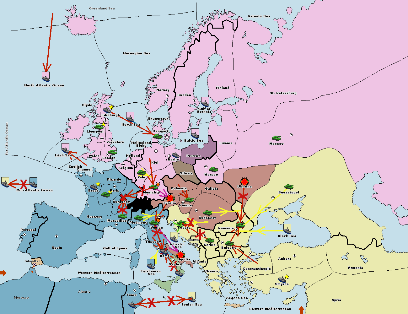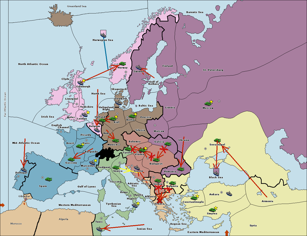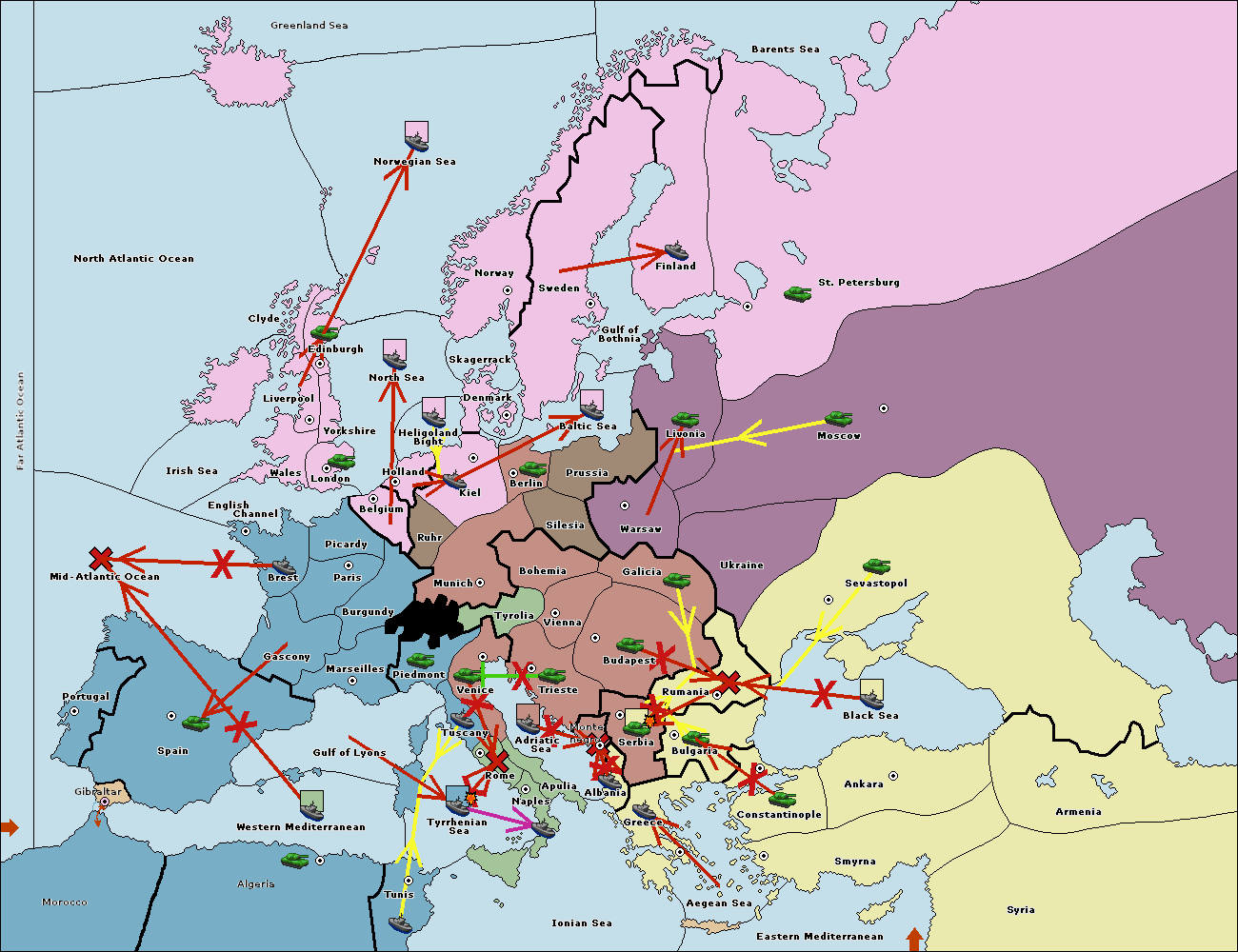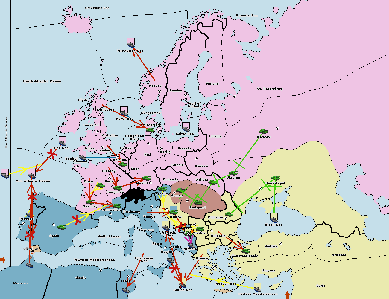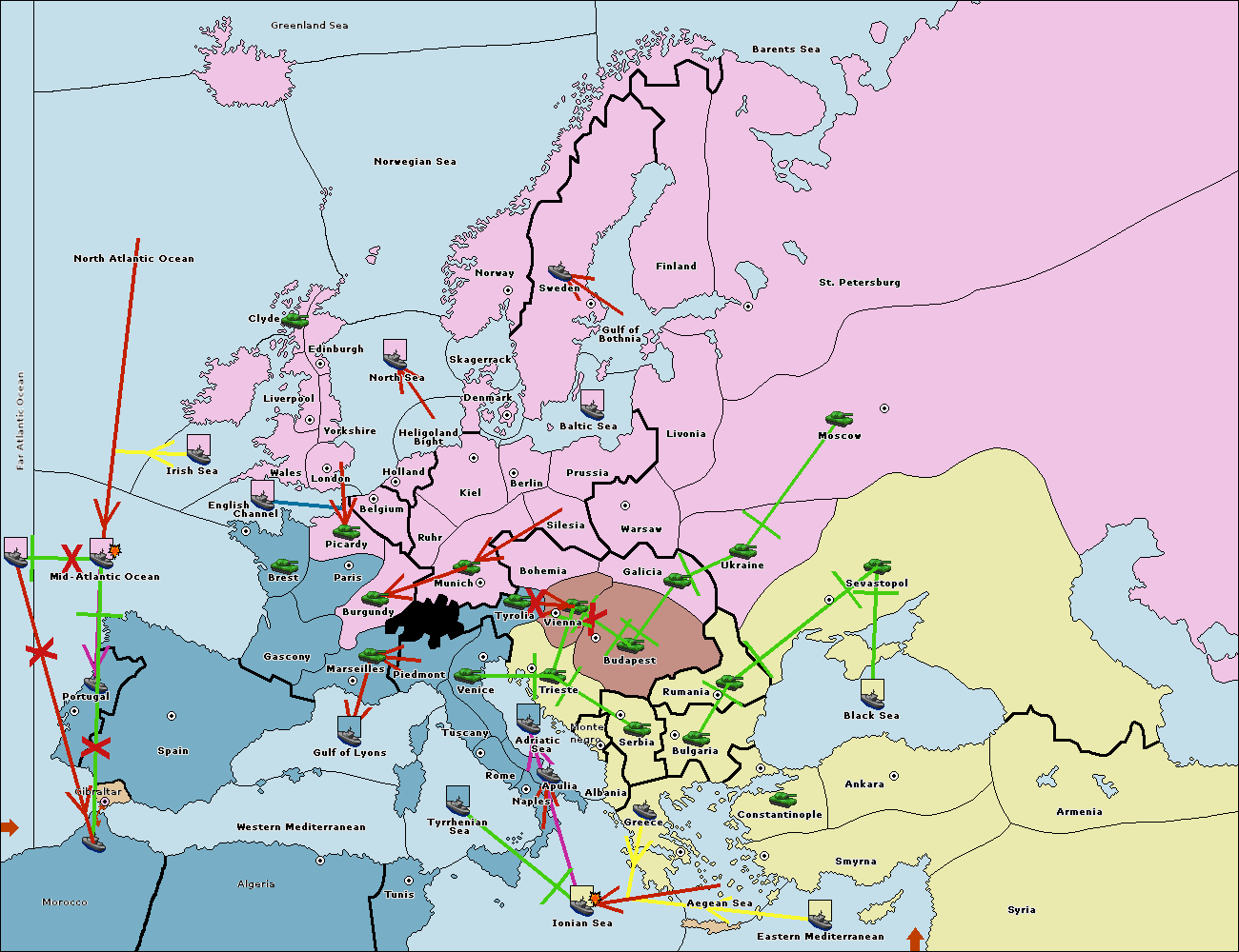 • Die Armee in Venedig support move nach Triest von Tirol. (gescheitert) (verdrängt)