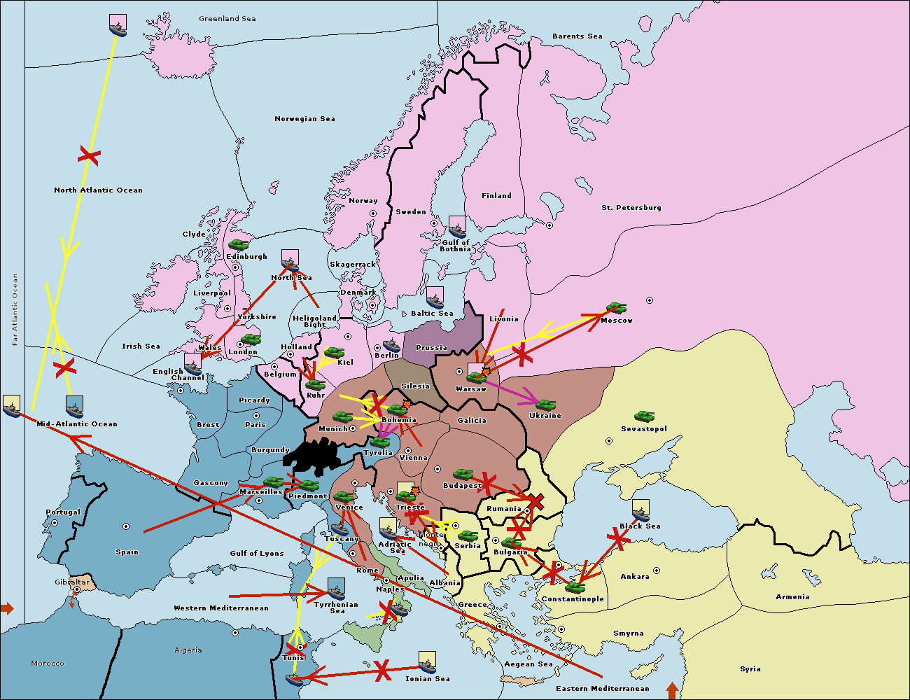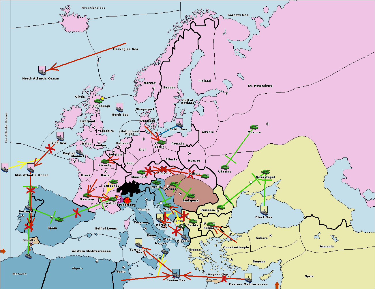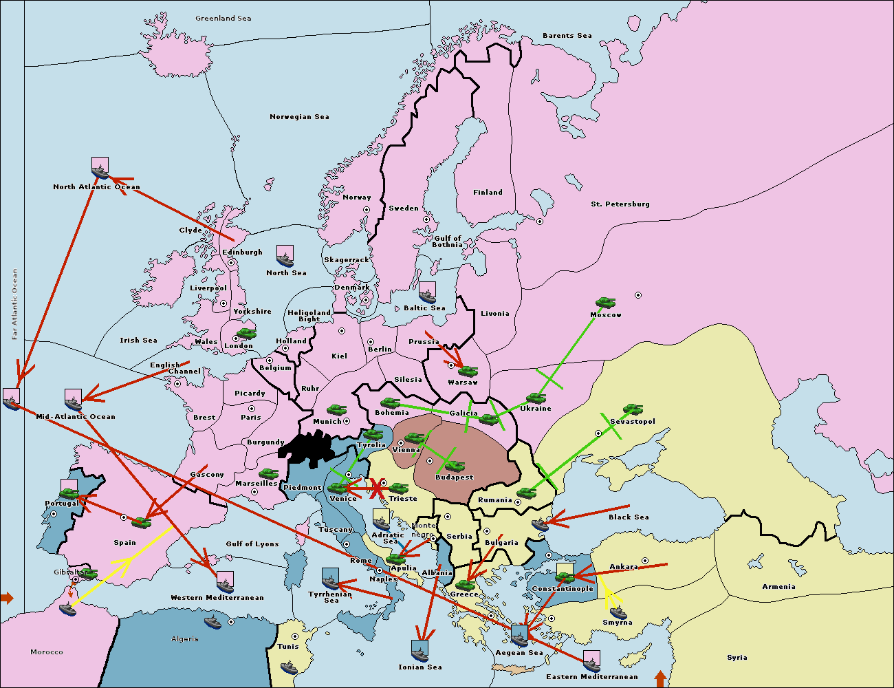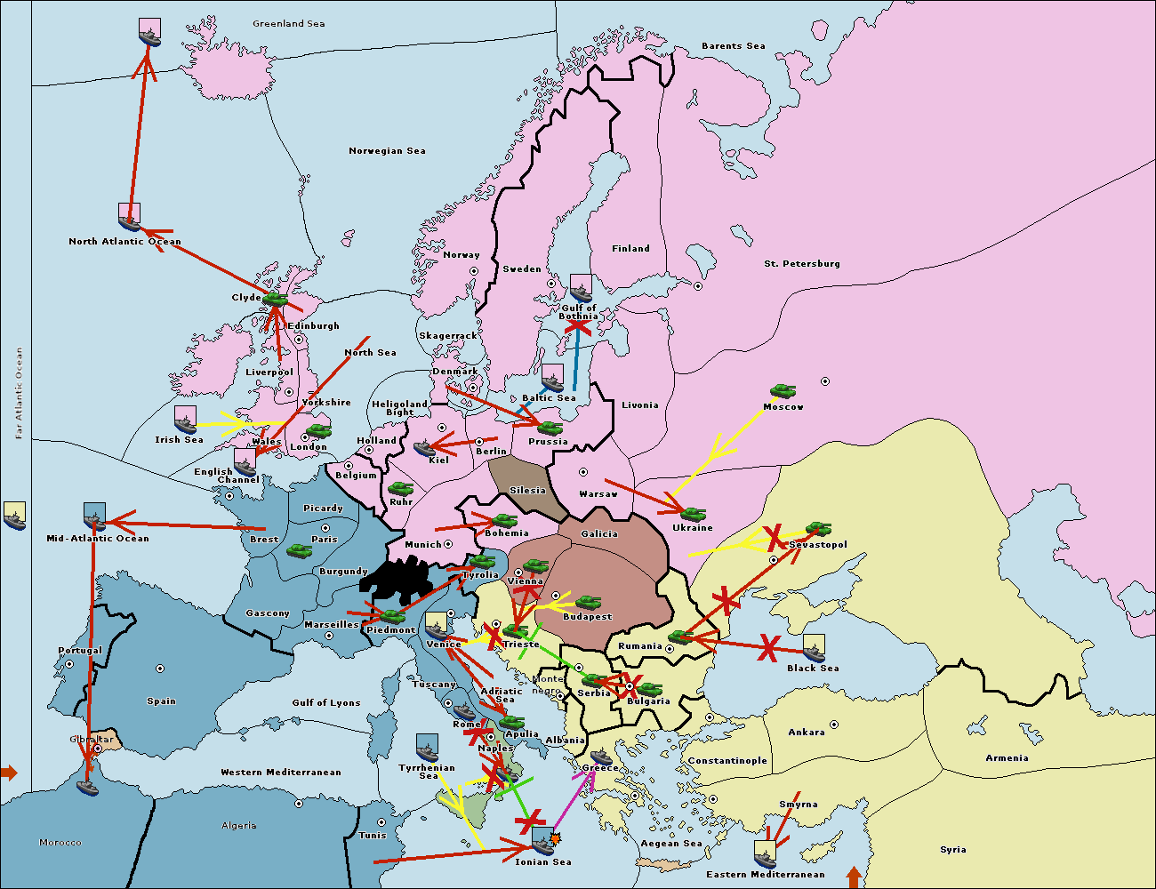 • Die Armee in Venedig support move nach Triest von Tirol. (gescheitert) (verdrängt)